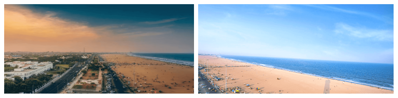 Marina Beach, or simply the Marina, is a natural urban beach in Chennai, Tamil Nadu, India, along the Bay of Bengal. The beach runs from near Fort St. George in the north to Foreshore Estate in the south, a distance of 6.0 km, making it the second longest urban beach in the world, after Cox's Bazar Beach.